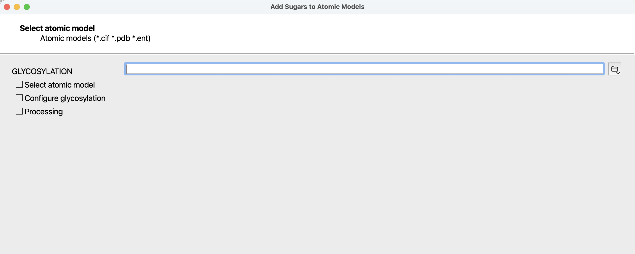 GLYCOSYLATION accepts atomic coordinate data in .pdb or .cif format as input. This may be either a relative or absolute file path.